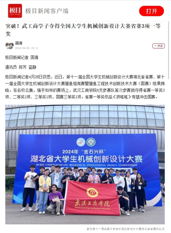 极目新闻记者4月28日获悉,近日,第十一届全国大学生机械创新设计大赛湖北省省赛、第十一届全国大学生机械创新设计大赛慧鱼组竞赛暨慧鱼工程技术创新技术大赛(国赛)结果揭晓。在名校云集,强手如林的赛场上,武汉工商学院6支参赛队首次参赛就夺得省赛一等奖3项、二等奖1项、三等奖1项,国赛三等奖1项。省赛一等奖作品《顶呱呱》有望冲击国赛。