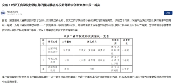 日前,第四届湖北省高校教师教学创新大赛结果正式公布,武汉工商学院教师参赛成绩取得历史性突破。该校艺术与设计学院宋盈滨教师团队获课程思政副高组一等奖,为湖北省同类高校中唯一一个获副高组一等奖的教师团队,环境与生物工程学院刘瑶教师团队获新工科中级及以下组二等奖,艺术与设计学院李由教师团队获新文科副高组三等奖,武汉工商学院还荣获大赛优秀组织奖。