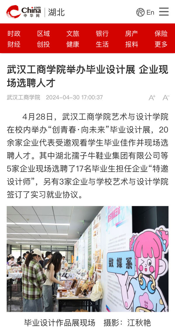4月28日,武汉工商学院艺术与设计学院在校内举办“创青春·向未来”毕业设计展,20余家企业代表受邀观看学生毕业佳作并现场选聘人才。其中湖北孺子牛鞋业集团有限公司等5家企业现场选聘了17名毕业生担任企业“特邀设计师”,另有3家企业与学校艺术与设计学院签订了实习就业协议。