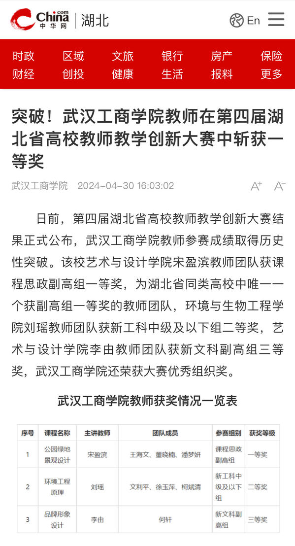日前,第四届湖北省高校教师教学创新大赛结果正式公布,武汉工商学院教师参赛成绩取得历史性突破。该校艺术与设计学院宋盈滨教师团队获课程思政副高组一等奖,为湖北省同类高校中唯一一个获副高组一等奖的教师团队,环境与生物工程学院刘瑶教师团队获新工科中级及以下组二等奖,艺术与设计学院李由教师团队获新文科副高组三等奖,武汉工商学院还荣获大赛优秀组织奖。