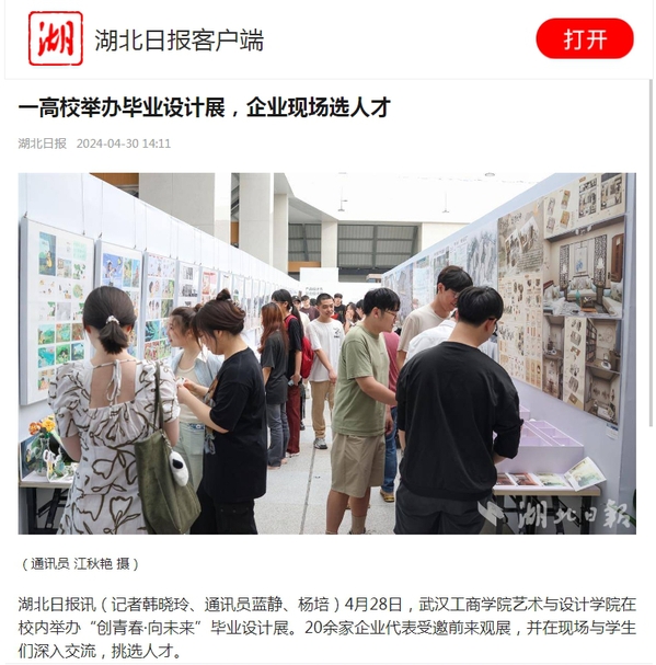 湖北日报讯(记者韩晓玲、通讯员蓝静、杨培)4月28日,武汉工商学院艺术与设计学院在校内举办“创青春·向未来”毕业设计展。20余家企业代表受邀前来观展,并在现场与学生们深入交流,挑选人才。