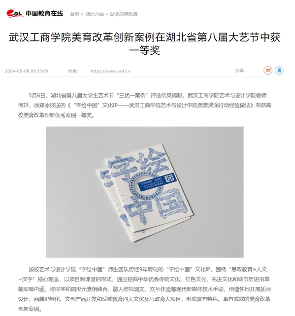 5月6日,湖北省第八届大学生艺术节“三优一案例”评选结果揭晓。武汉工商学院艺术与设计学院教师何轩、徐郑冰报送的《“字绘中国”文化IP——武汉工商学院艺术与设计学院美育浸润行动经验做法》荣获高校美育改革创新优秀案例一等奖。