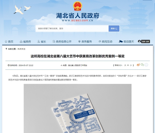 5月6日,湖北省第八届大学生艺术节“三优一案例”评选结果揭晓。武汉工商学院艺术与设计学院教师何轩、徐郑冰报送的《“字绘中国”文化IP——武汉工商学院艺术与设计学院美育浸润行动经验做法》荣获高校美育改革创新优秀案例一等奖。