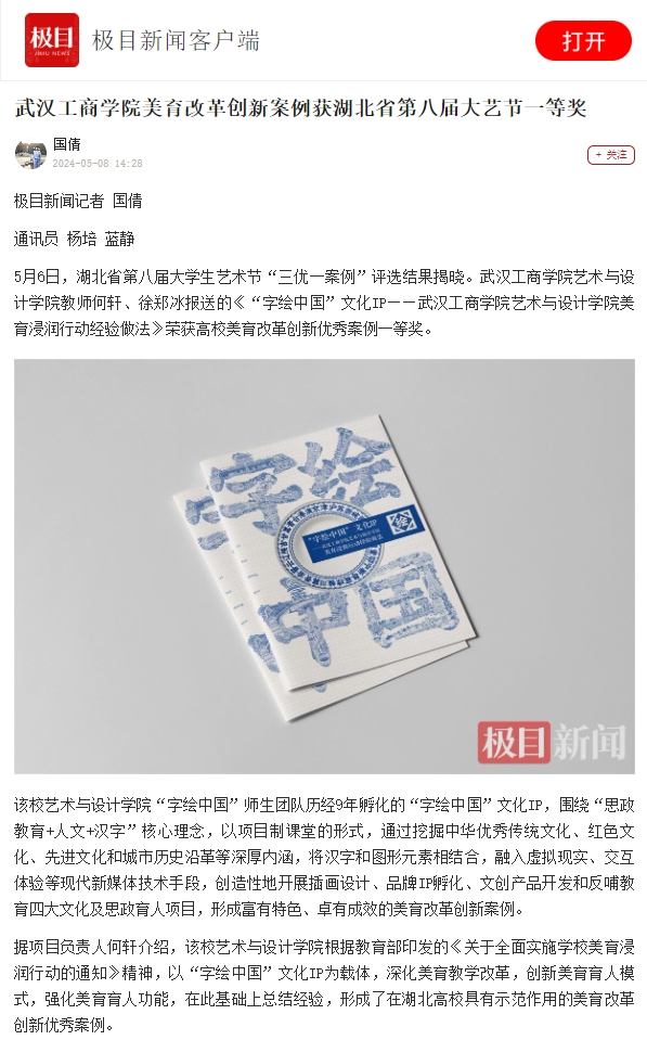 5月6日,湖北省第八届大学生艺术节“三优一案例”评选结果揭晓。武汉工商学院艺术与设计学院教师何轩、徐郑冰报送的《“字绘中国”文化IP——武汉工商学院艺术与设计学院美育浸润行动经验做法》荣获高校美育改革创新优秀案例一等奖。