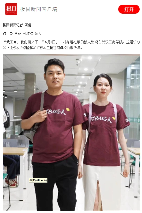 “武工商,我们回来了!”5月3日,一对身着礼服的新人出现在武汉工商学院。这是该校2014级校友冷焱隆和2017校友王艳红回母校拍婚纱照。