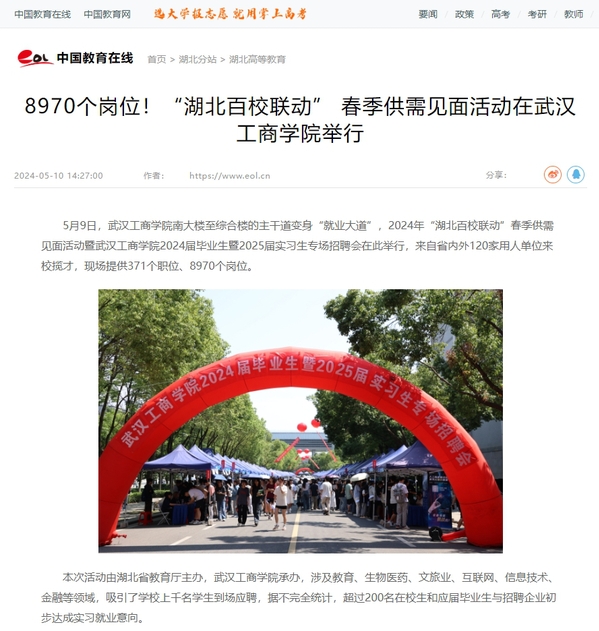 5月9日,武汉工商学院南大楼至综合楼的主干道变身“就业大道”,2024年“湖北百校联动”春季供需见面活动暨武汉工商学院2024届毕业生暨2025届实习生专场招聘会在此举行,来自省内外120家用人单位来校揽才,现场提供371个职位、8970个岗位。