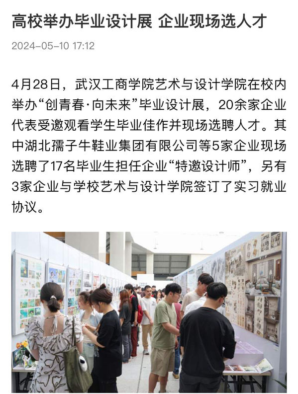 4月28日,武汉工商学院艺术与设计学院在校内举办“创青春·向未来”毕业设计展,20余家企业代表受邀观看学生毕业佳作并现场选聘人才。其中湖北孺子牛鞋业集团有限公司等5家企业现场选聘了17名毕业生担任企业“特邀设计师”,另有3家企业与学校艺术与设计学院签订了实习就业协议。