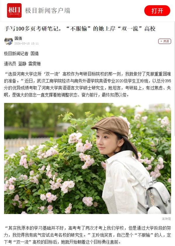 “选择河南大学这所‘双一流’高校作为考研目标院校的那一刻,我就做好了克服重重困难的准备。”近日,武汉工商学院经济与商务外语学院英语专业2020级学生王玲珑,以总分395分的优异成绩考取了河南大学英语语言文学硕士研究生,她坦言,考研路上,有过焦虑、失眠,是强大的信念一直支撑着她调整状态、奋力前行,最终如愿以偿。