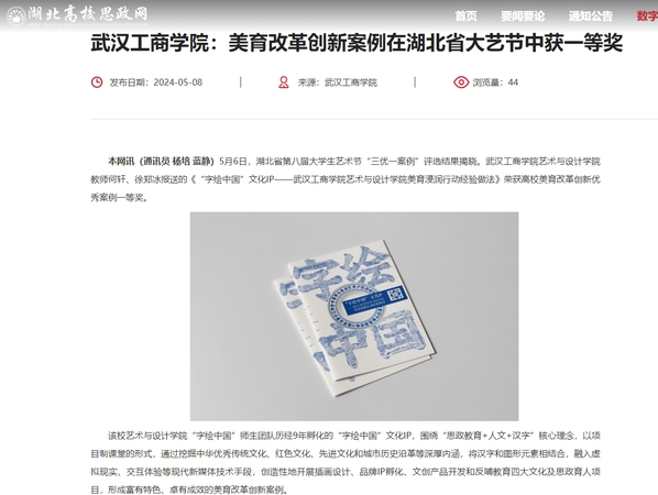 项目负责人何轩介绍,学校艺术与设计学院根据教育部印发的《关于全面实施学校美育浸润行动的通知》精神,以“字绘中国”文化IP为载体,深化美育教学改革,创新美育育人模式,强化美育育人功能,在此基础上总结经验,形成了在湖北高校具有示范作用的美育改革创新优秀案例。