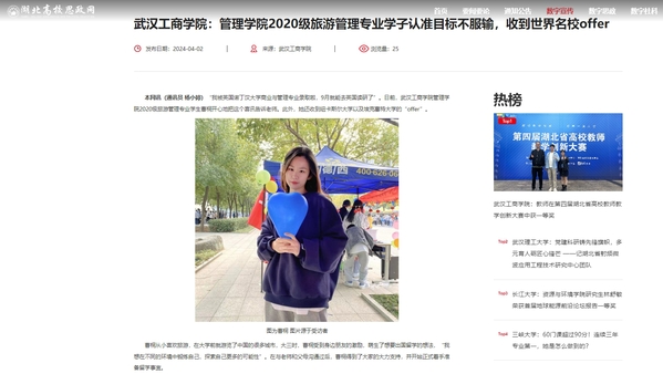 本网讯(通讯员 杨小婷)“我被英国诺丁汉大学商业与管理专业录取啦,9月就能去英国读研了”。日前,武汉工商学院管理学院2020级旅游管理专业学生曹桐开心地把这个喜讯告诉老师。此外,她还收到纽卡斯尔大学以及埃克塞特大学的“offer”。
