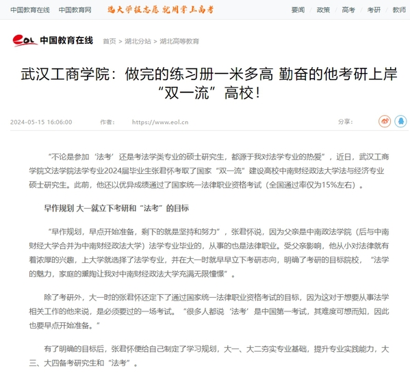 “不论是参加‘法考’还是考法学类专业的硕士研究生,都源于我对法学专业的热爱”,近日,武汉工商学院文法学院法学专业2024届毕业生张君怀考取了国家“双一流”建设高校中南财经政法大学法与经济专业硕士研究生。此前,他还以优异成绩通过了国家统一法律职业资格考试(全国通过率仅为15%左右)。