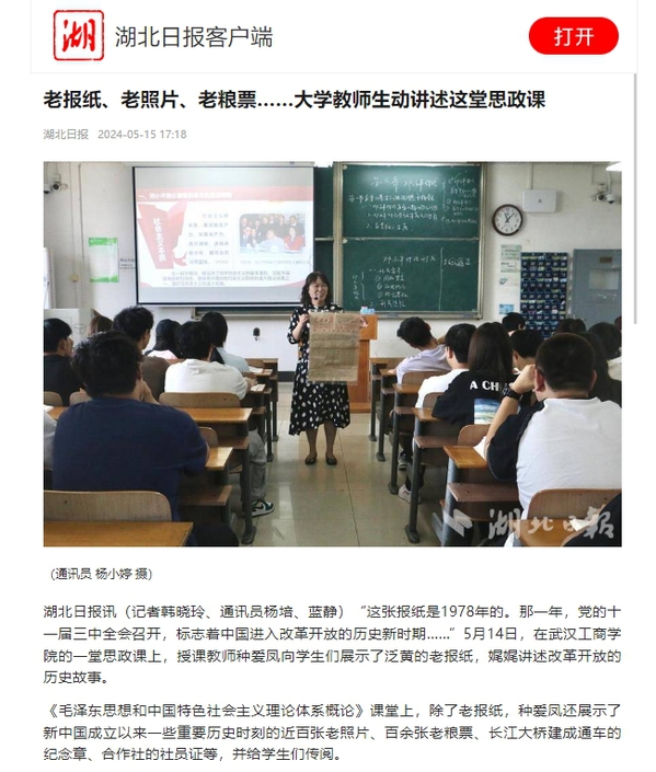 湖北日报讯(记者韩晓玲、通讯员杨培、蓝静)“这张报纸是1978年的。那一年,党的十一届三中全会召开,标志着中国进入改革开放的历史新时期……”5月14日,在武汉工商学院的一堂思政课上,授课教师种爱凤向学生们展示了泛黄的老报纸,娓娓讲述改革开放的历史故事。