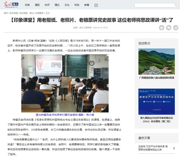 种爱凤老师讲的是《毛泽东思想和中国特色社会主义理论体系概论》的课程,在课堂上,她除了展示中国共产党发展历史上特殊时期的一些老报纸外,还展示了新中国成立以来一些重要历史时刻的近百张老照片、100多张老粮票、长江大桥建成通车的纪念章、合作社的社员证等,并在课堂上给同学们一一传阅