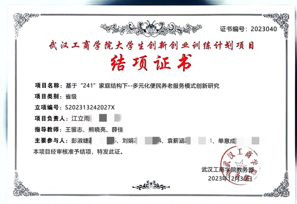 在武汉工商学院读大三时,她在专业教师熊晓亮的带领下,参与到省级大学生创新创业训练计划项目中,成为《基于“241”家庭结构下——多元化便民养老服务模式创新研究》项目团队的核心成员,主要负责计划书撰写、市场调研和现场汇报工作。该项目主要是为老年人群提供“互联网+居家上门护理”服务,在当前老龄化的社会中具有较强的可行性,目前该项目已经顺利结项。