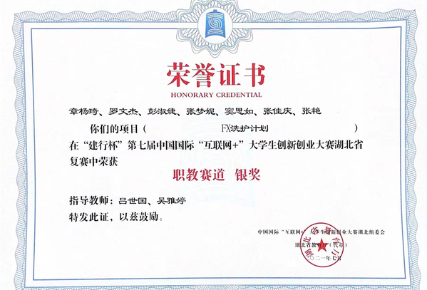 大二时,在老师的指导下,她和同学们一起参加第七届中国国际“互联网+”大学生创新创业大赛湖北省复赛,她们的创新创业项目《FX洗护计划》还获得了银奖。