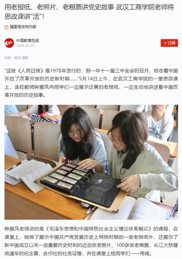 “这张《人民日报》是1978年发行的,那一年十一届三中全会的召开,标志着中国开启了改革开放的历史新时期……”5月14日上午,在武汉工商学院的一堂思政课上,该校教师种爱凤向同学们一边展示泛黄的老报纸,一边生动地讲述着中国改革开放的历史故事。