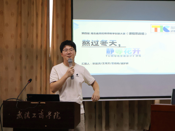 教师宋盈滨则以“熬过冬天,静待花开”为主题,围绕“备赛准备”“文件解读”“材料撰写”“ppt制作”“答辩技巧”五个方面介绍了自己的参赛经验。“在答辩汇报时一定要做到自信和真诚,这是十分有用的答辩技巧,也是引导专家对课程感兴趣的重要因素。”他建议大家要充分掌握和活用答辩的技巧与艺术,做到以情带声。