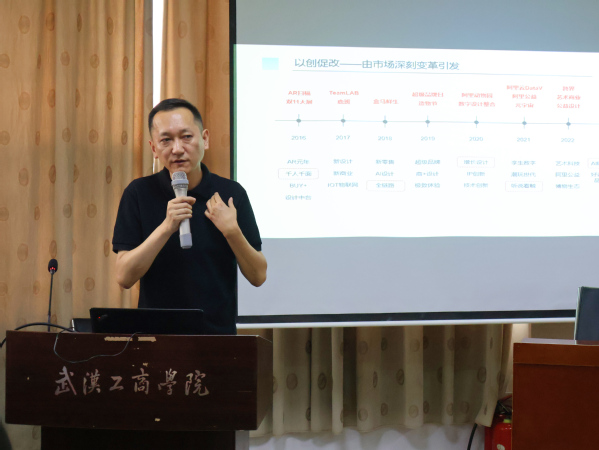 随后,教师李由结合自己多年来的课程教学体会和参赛经验,以“以赛促教、以创促改”为主题,分析了教学创新大赛省赛的组别分类、入围作品数量和评分标准,帮助大家进一步了解大赛的流程和规则。他还向大家分享了其独创的、面向未来数智与艺术融合的“真实项目(Real)-分析问题(Analyze)-创意发想(Ideas)-方案设计(Solution)-实效成果(Effects)”RAISE提升策略,建议大家要在日常教学中做有心人,多观察、勤思考,积累项目资源素材和比赛经验。