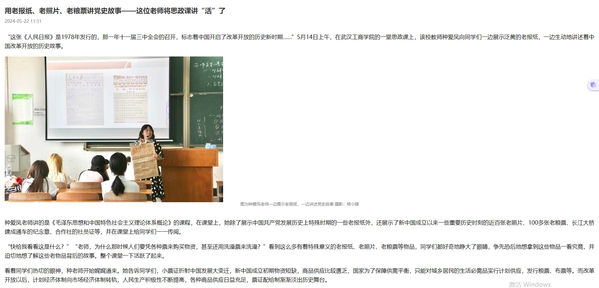“这张《人民日报》是1978年发行的,那一年十一届三中全会的召开,标志着中国开启了改革开放的历史新时期……”5月14日上午,在武汉工商学院的一堂思政课上,该校教师种爱凤向同学们一边展示泛黄的老报纸,一边生动地讲述着中国改革开放的历史故事。