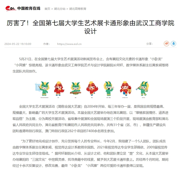 5月21日,在全国第七届大学生艺术展演活动新闻发布会上,含有襄阳文化元素的卡通形象“小卧龙”“小凤雏”惊艳亮相,该卡通形象由武汉工商学院艺术与设计学院副院长何轩、数字媒体系副主任黄家昶等师生团队共同创作。