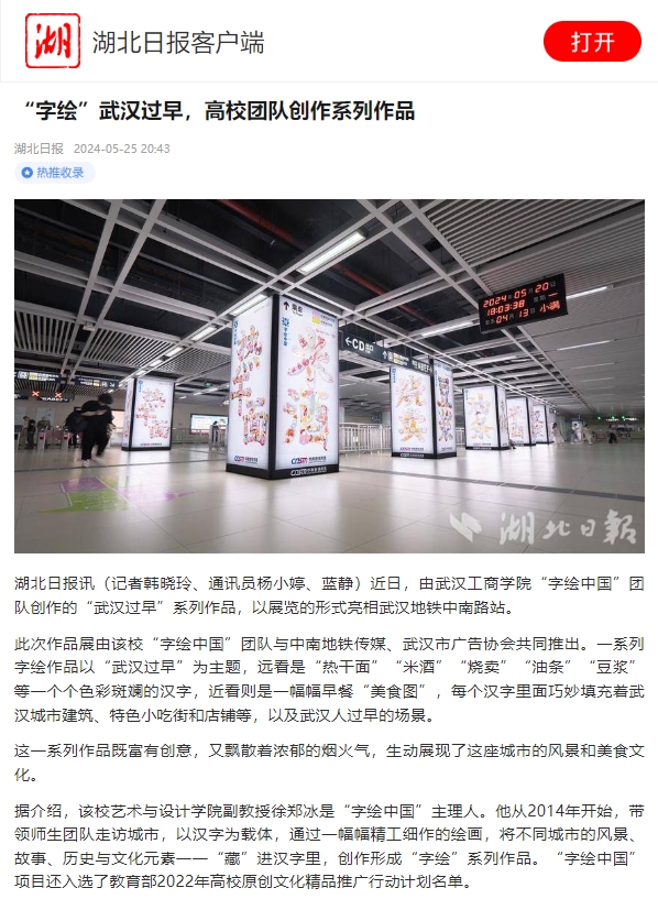 湖北日报讯(记者韩晓玲、通讯员杨小婷、蓝静)近日,由武汉工商学院“字绘中国”团队创作的“武汉过早”系列作品,以展览的形式亮相武汉地铁中南路站。