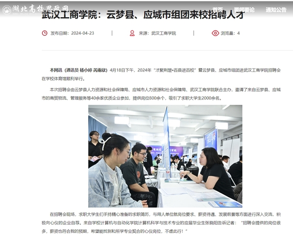 云梦县公共就业和人才服务中心副主任杨世鹏介绍道:“此次招聘会为企业和高校毕业生之间提供了一个面对面、零距离的交流平台,有效促进了就业信息的流通和匹配。”他希望,未来能与武汉工商学院加强合作与交流,吸引更多优秀的人才到云梦县建功立业。