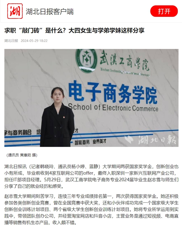 湖北日报讯(记者韩晓玲、通讯员杨小婷、蓝静)大学期间两获国家奖学金,创新创业也小有所成,毕业前收到4家互联网公司的offer,最终入职深圳一家新兴互联网产业公司,担任IT部项目经理。5月29日,武汉工商学院电子商务专业2024届毕业生赵志雪与师生们分享了自己的就业经历和感受。