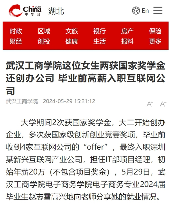 大学期间2次获国家奖学金,大二开始创办企业,多次获国家级创新创业竞赛奖项,毕业前收到4家互联网公司的“offer”,最终入职深圳某新兴互联网产业公司,担任IT部项目经理,初始年薪20万(不包含项目奖金),5月29日,武汉工商学院电子商务学院电子商务专业2024届毕业生赵志雪高兴地向老师分享她的就业情况。