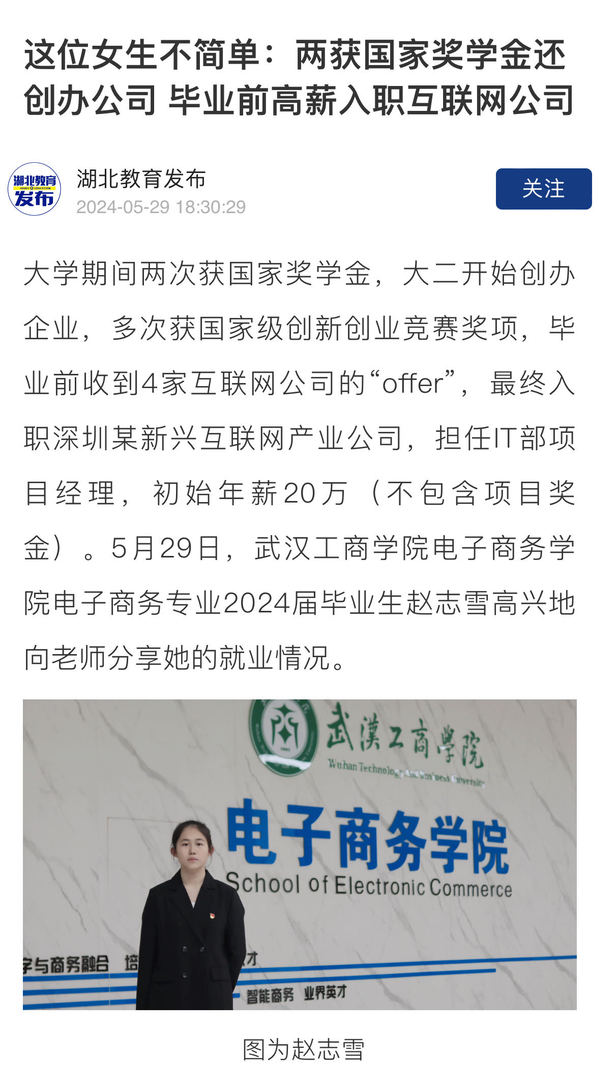 大学期间两次获国家奖学金,大二开始创办企业,多次获国家级创新创业竞赛奖项,毕业前收到4家互联网公司的“offer”,最终入职深圳某新兴互联网产业公司,担任IT部项目经理,初始年薪20万(不包含项目奖金)。5月29日,武汉工商学院电子商务学院电子商务专业2024届毕业生赵志雪高兴地向老师分享她的就业情况。