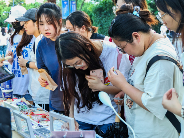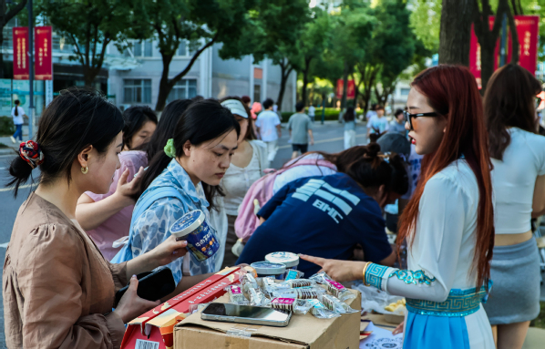 “原汁原味的内蒙古牛肉干奶茶要不要品尝一下”“同学,要不要来体验一下美甲”……市集开始后,叫卖声此起彼伏,市集上内蒙古特产美食、书法作品、明信片、花式气球、棉袜等商品琳琅满目,价格从3元到200元不等。活动现场人流涌动,吸引了不少同学前来“赶集”。