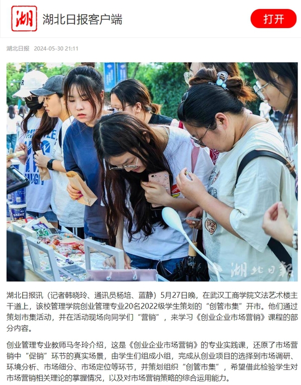 湖北日报讯(记者韩晓玲、通讯员杨培、蓝静)5月27日晚,在武汉工商学院文法艺术楼主干道上,该校管理学院创业管理专业20名2022级学生策划的“创管市集”开市。他们通过策划市集活动,并在活动现场向同学们“营销”,来学习《创业企业市场营销》课程的部分内容。