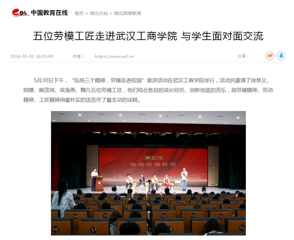 据悉,本次宣讲会由湖北省总工会主办,湖北省劳动模范协会与武汉工商学院承办,来自湖北省总工会科教文卫体工会、湖北省劳动模范协会的领导,以及武汉工商学院的600余名师生共同参加了此次活动。(通讯员:李洋洋 杨小婷 陈雯茜)