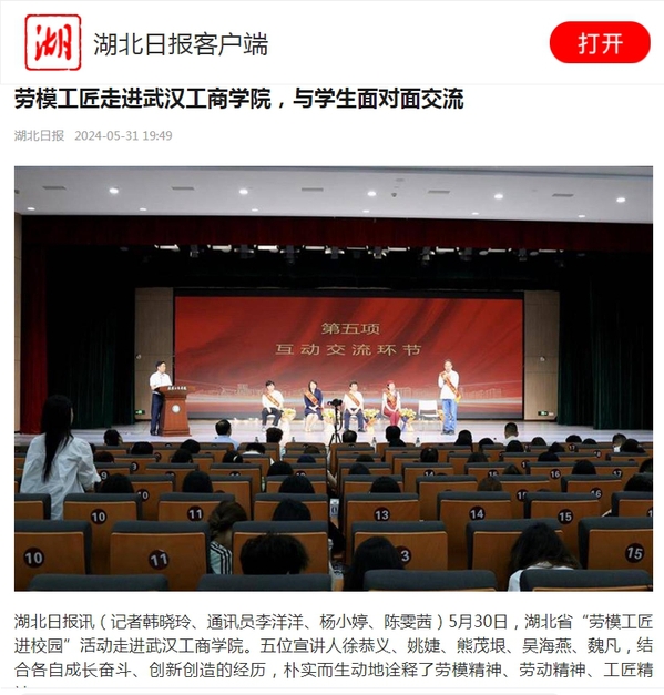 湖北日报讯(记者韩晓玲、通讯员李洋洋、杨小婷、陈雯茜)5月30日,湖北省“劳模工匠进校园”活动走进武汉工商学院。五位宣讲人徐恭义、姚婕、熊茂垠、吴海燕、魏凡,结合各自成长奋斗、创新创造的经历,朴实而生动地诠释了劳模精神、劳动精神、工匠精神。
