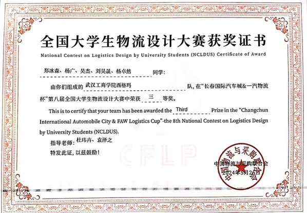 其中,由物流学院物流工程系主任杜玮卉、专职教师袁泽之指导,物流工程专业2022级学生郑冰森、刘昊晟、杨卓然、吴杰,物流管理专业2022级学生杨广组成的“西格玛”队获得全国三等奖,5位参赛学生均取得中级物流师资格证书;由物流学院物流管理系主任操露、专职教师李宇涵指导,物流管理专业2022级学生吴右辅、黄女娲、杨铖煜、吕家璘、苏梦迪组成的“一汽速通”队获全国优胜奖。