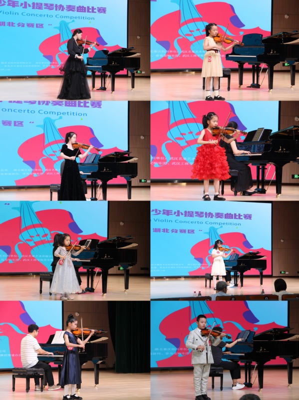 本次比赛由武汉工商学院音乐舞蹈筹建办公室主任李果教授担任艺术总监,武汉音乐学院肖菲教授担任评委会主席,特邀10位在专业音乐院校教学、乐团演奏、独奏等领域知名的小提琴演奏家和教育家来到现场担任评委。大赛根据参赛选手的专业、年龄和学历共分为幼儿组、业余儿童A组、业余儿童B组、业余少年A组、业余少年B组、专业儿童组、专业少年组和专业青年组共8类组别。每组选手按照抽签顺序结果,在武汉工商学院音乐舞蹈筹建办公室师生们的引领下,依次上台进行小提琴表演。