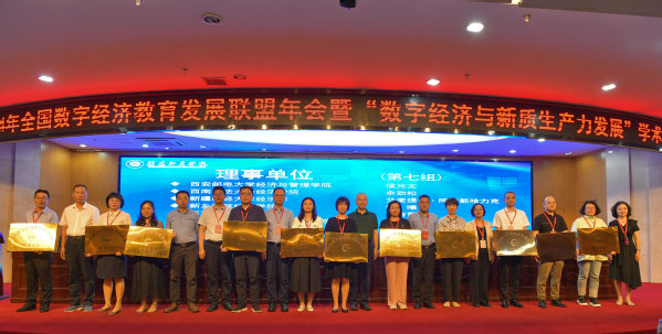 图为张晓骏院长(从右到左第八位)领取“全国数字经济教育发展联盟理事单位”牌匾