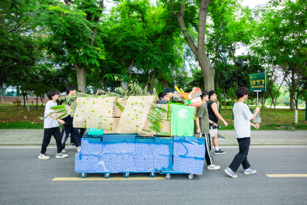 巡游队伍中,每条“龙舟”的装扮都个性十足,凸显了各学院的特点以及端午的特色。人工智能学院的“AI舰”结合学科专业特色,在制作上采用钢铁材料搭建成船舰形状,内部由智能车控制,船身上融入龙舟和粽子等文化元素;环境与生物工程学院的“艾香‘竹’梦”龙舟,践行废物利用的环保理念,以废弃纸箱为船体支撑,以竹编工艺构建龙身,黏上艾草作为龙鳞,底部装饰有波浪纹样,寓意师生一路乘风破浪;艺术与设计学院的“艺”条龙龙身都由学院学生彩绘的纸盘组成,上面的图案多是由中国传统纹样“藻井”、粽子及龙的形象组成……各具特色、极有创意的“龙舟”,让沿途欣赏的学生目不暇接,纷纷用手机、相机定格这欢乐而壮观的场景。