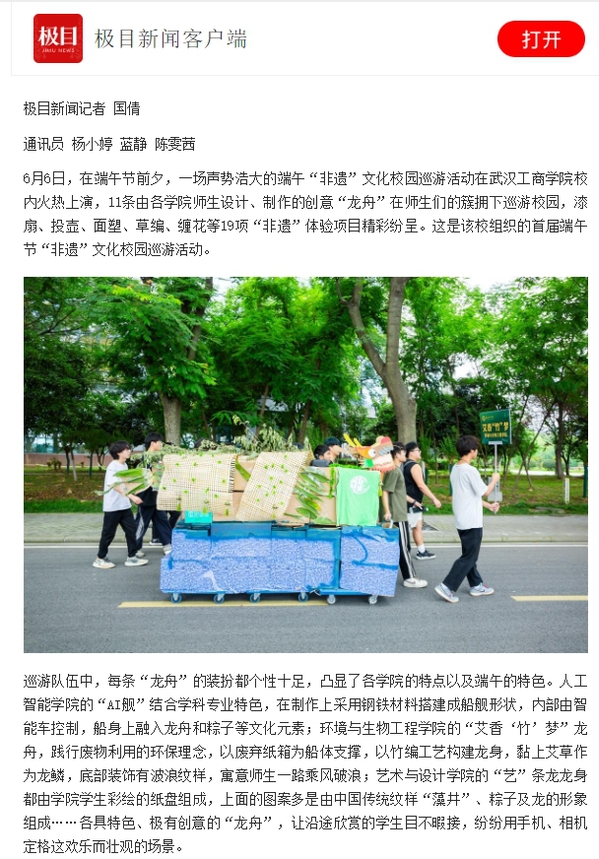 6月6日,在端午节前夕,一场声势浩大的端午“非遗”文化校园巡游活动在武汉工商学院校内火热上演,11条由各学院师生设计、制作的创意“龙舟”在师生们的簇拥下巡游校园,漆扇、投壶、面塑、草编、缠花等19项“非遗”体验项目精彩纷呈。这是该校组织的首届端午节“非遗”文化校园巡游活动。