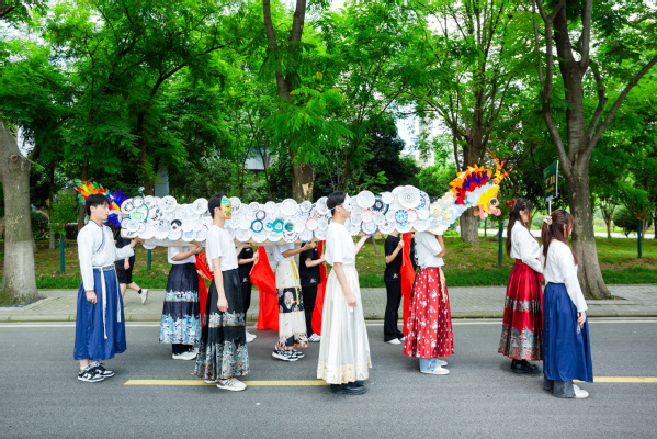 巡游队伍中,每条“龙舟”不仅融入端午文化元素,还凸显了各学院特点。人工智能学院的“AI舰”结合学科专业特色,在制作上采用钢铁材料搭建成船舰形状,内部由智能车控制,船身上融入龙舟和粽子等文化元素;环境与生物工程学院的“艾香‘竹’梦”龙舟,践行废物利用的环保理念,以废弃纸箱为船体支撑,以竹编工艺构建龙身,黏上艾草作为龙鳞,底部装饰有波浪纹样,寓意师生一路乘风破浪;艺术与设计学院的“艺”条龙龙身都由学院学生彩绘的纸盘组成,上面的图案多是由中国传统纹样“藻井”、粽子及龙的形象组成……各具特色、极有创意的“龙舟”,让沿途欣赏的学生目不暇接,纷纷用手机、相机定格这欢乐而壮观的场景。