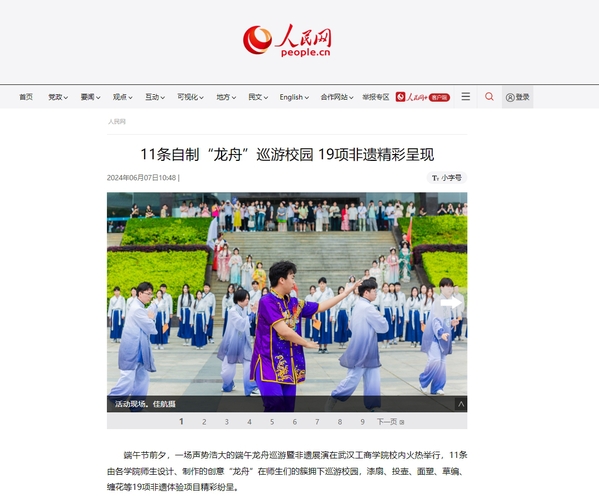 端午节前夕,一场声势浩大的端午龙舟巡游暨非遗展演在武汉工商学院校内火热举行,11条由各学院师生设计、制作的创意“龙舟”在师生们的簇拥下巡游校园,漆扇、投壶、面塑、草编、缠花等19项非遗体验项目精彩纷呈。