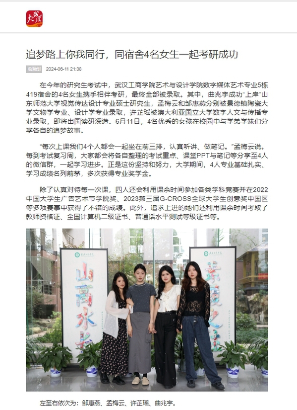 在今年的研究生考试中,武汉工商学院艺术与设计学院数字媒体艺术专业5栋419宿舍的4名女生携手相伴考研,最终全部被录取。其中,曲兆宇成功“上岸”山东师范大学视觉传达设计专业硕士研究生,孟梅云和邹惠燕分别被景德镇陶瓷大学文物学专业、设计学专业录取,许芷瑶被澳大利亚国立大学数字人文与传播专业录取,即将出国读研深造。6月11日,4名优秀的女孩在校园中与学弟学妹们分享各自的追梦故事。