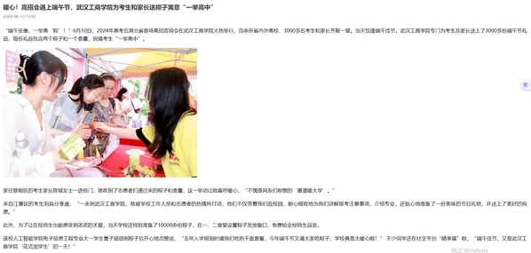 据悉,武汉工商学院秉持“以生为本”的办学理念,形成了“温暖一家人”的特色家园文化,持续打造“最温暖大学”。2023年学校开通了“校长直通车”平台,倾听学生意见,将学生最关心的“关键小事”,变成学校十分重视的“民生大事”,真正将以学生为中心落到实处。以校长为首等校领导向学生公布手机号码,对于学生提出的好建议与合理诉求,千方百计给予采纳、帮助和解决。学校还通过请学生吃校庆餐、热干面、粽子等一系列暖心举措关爱学生。前不久,有学生给孔建益校长发短信,说想吃肉粽子,于是今年端午节除了甜粽,咸粽学校也安排上了。