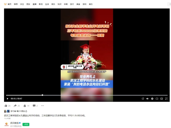 武汉教视视频号:武汉工商学院校长孔建益公布手机号码,三年回复学生3万多条短信,平均11.9小时办结。