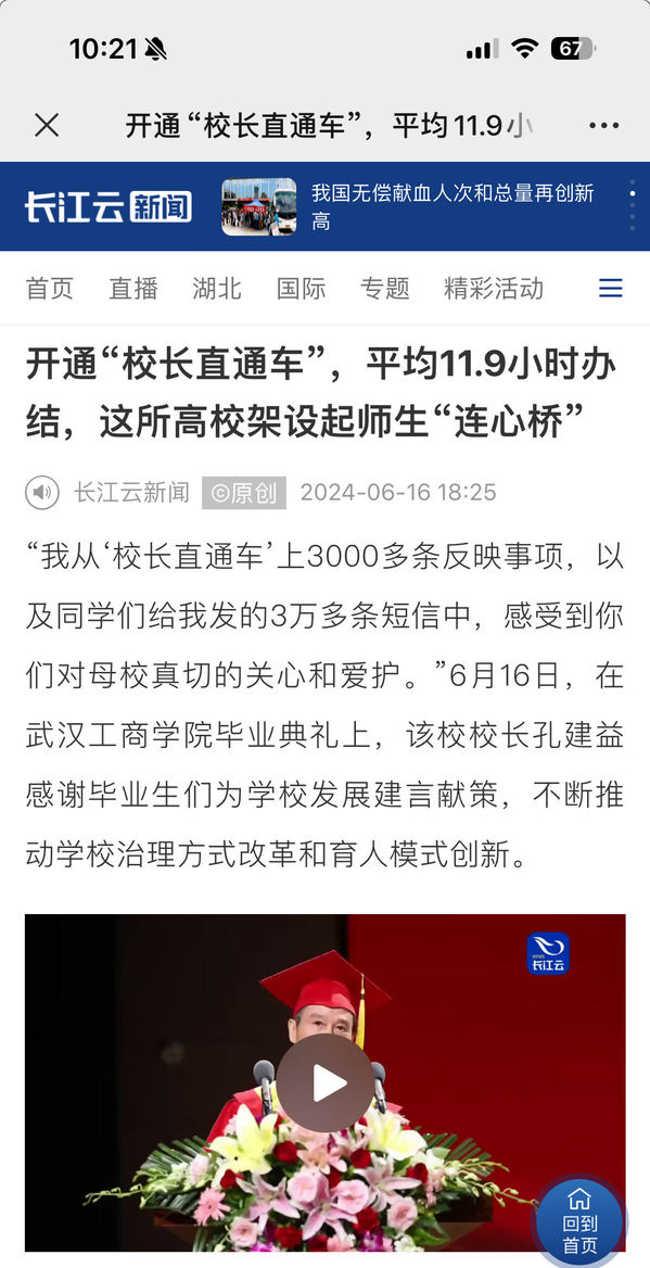 “我从‘校长直通车’上3000多条反映事项,以及同学们给我发的3万多条短信中,感受到你们对母校真切的关心和爱护。”6月16日,在武汉工商学院毕业典礼上,该校校长孔建益感谢毕业生们为学校发展建言献策,不断推动学校治理方式改革和育人模式创新。