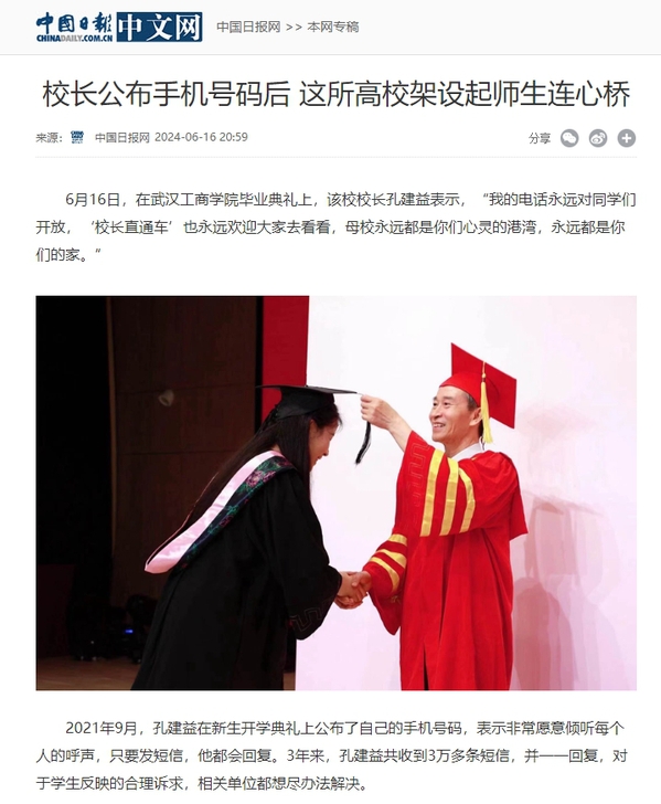 6月16日,在武汉工商学院毕业典礼上,该校校长孔建益表示,“我的电话永远对同学们开放,‘校长直通车’也永远欢迎大家去看看,母校永远都是你们心灵的港湾,永远都是你们的家。”
