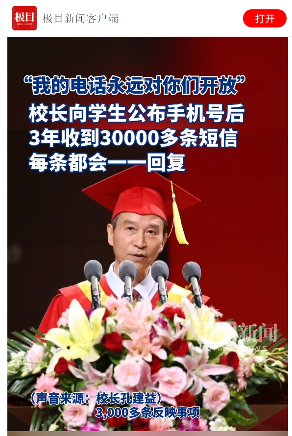 早在2021年9月,孔建益校长就在新生开学典礼上公布了手机号码,表示作为校长,他非常愿意倾听每个人的呼声,只要发短信,都会回复。而今快3年过去了,孔建益校长共收到3万多条短信,全部一一回复,对于学生反映的合理诉求,相关单位都想尽办法解决。该校也因此被很多网友称为“最温暖大学”。