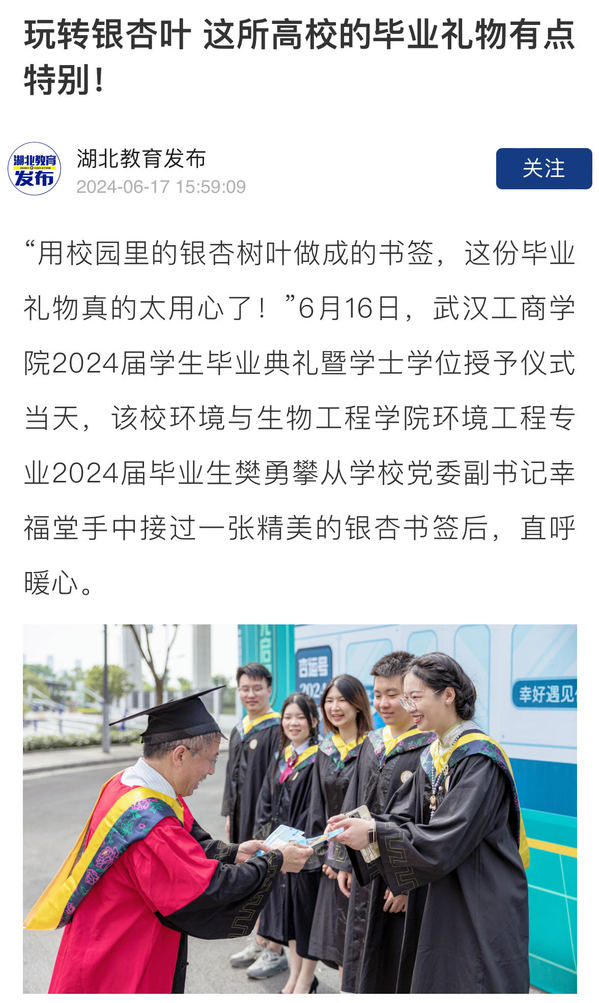 “用校园里的银杏树叶做成的书签,这份毕业礼物真的太用心了!”6月16日,武汉工商学院2024届学生毕业典礼暨学士学位授予仪式当天,该校环境与生物工程学院环境工程专业2024届毕业生樊勇攀从学校党委副书记幸福堂手中接过一张精美的银杏书签后,直呼暖心。