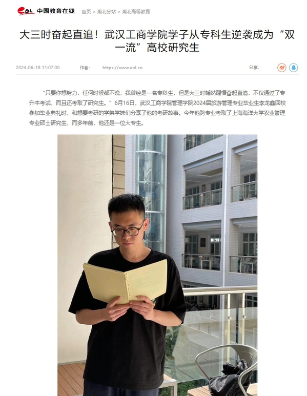 “只要你想努力,任何时候都不晚,我曾经是一名专科生,但是大三时幡然醒悟奋起直追,不仅通过了专升本考试,而且还考取了研究生。”6月16日,武汉工商学院管理学院2024届旅游管理专业毕业生李龙鑫回校参加毕业典礼时,和想要考研的学弟学妹们分享了他的考研故事。今年他跨专业考取了上海海洋大学农业管理专业硕士研究生,而多年前,他还是一位大专生。