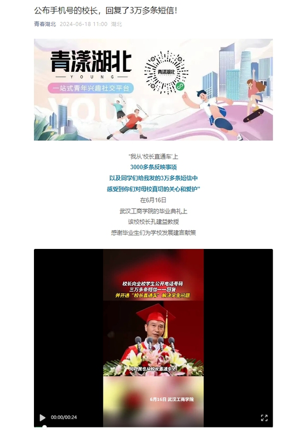 青春湖北微信公众号:公布手机号的校长,回复了3万多条短信!