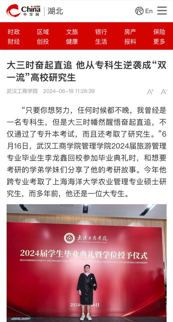 “只要你想努力,任何时候都不晚,我曾经是一名专科生,但是大三时幡然醒悟奋起直追,不仅通过了专升本考试,而且还考取了研究生。”6月16日,武汉工商学院管理学院2024届旅游管理专业毕业生李龙鑫回校参加毕业典礼时,和想要考研的学弟学妹们分享了他的考研故事。今年他跨专业考取了上海海洋大学农业管理专业硕士研究生,而多年前,他还是一位大专生。